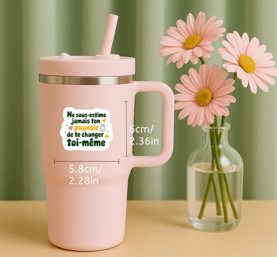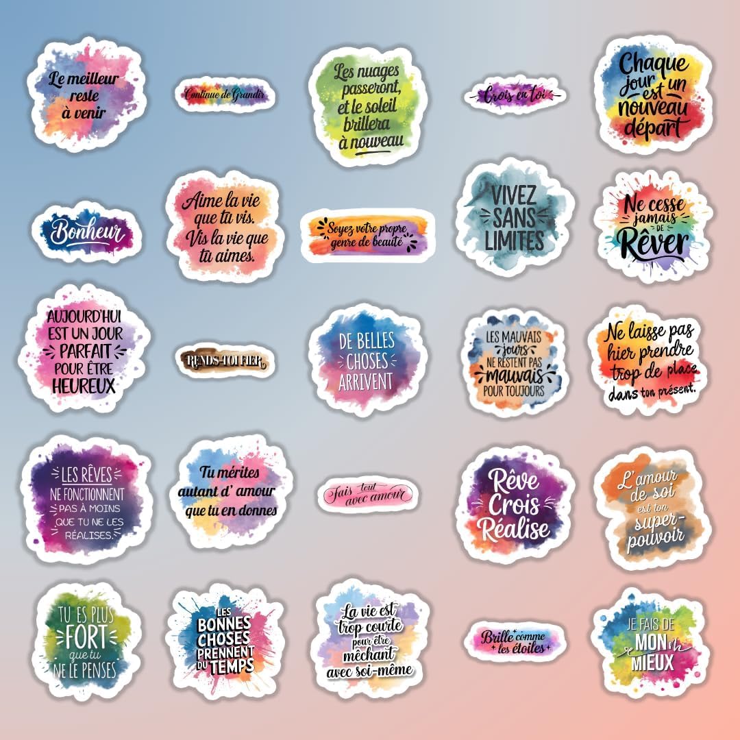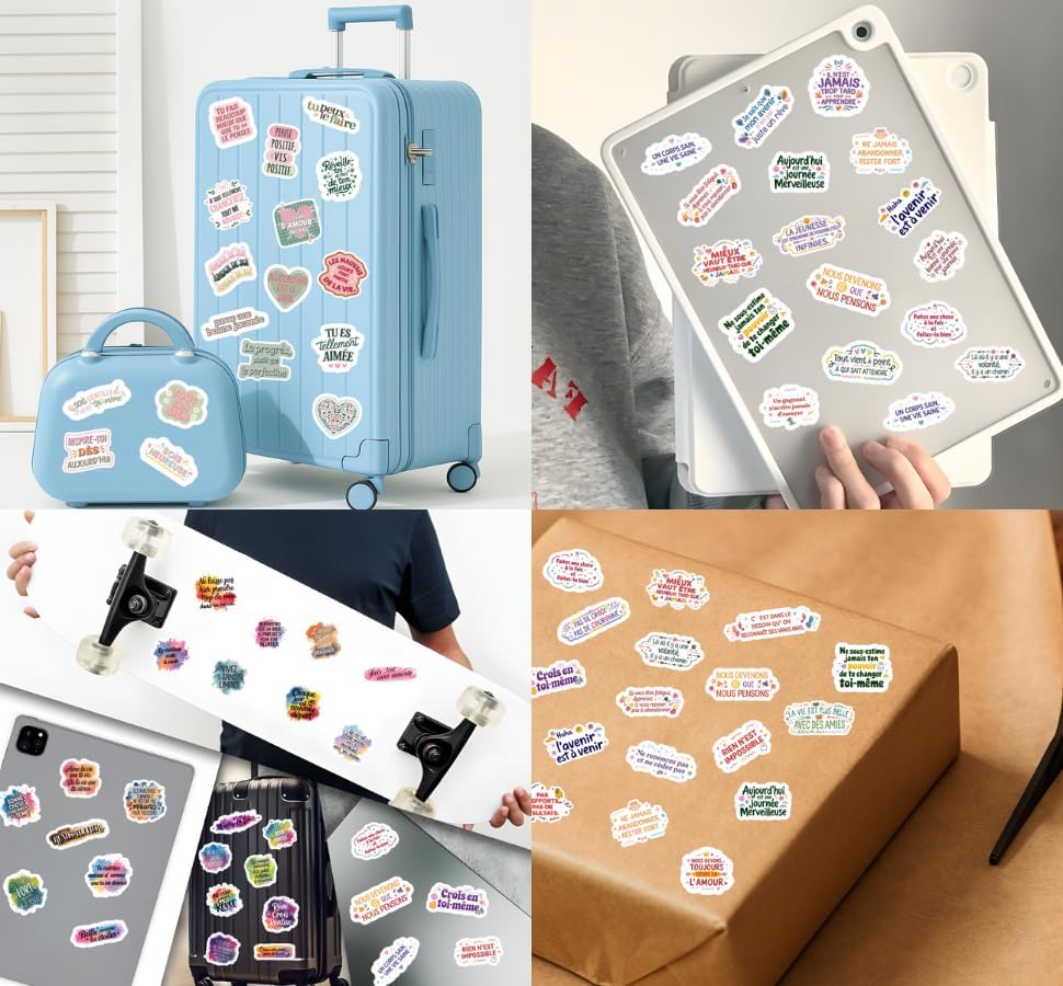 Peuvent aussi être collés sur un PC portable, une coque de téléphone, une bouteille d’eau, une tasse ou une valise pour apporter des touches de couleur et de motivation.