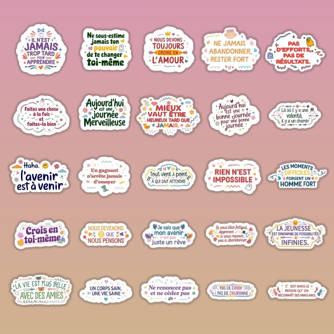 Contenu : 75 autocollants tous différents, avec citations et designs variés.