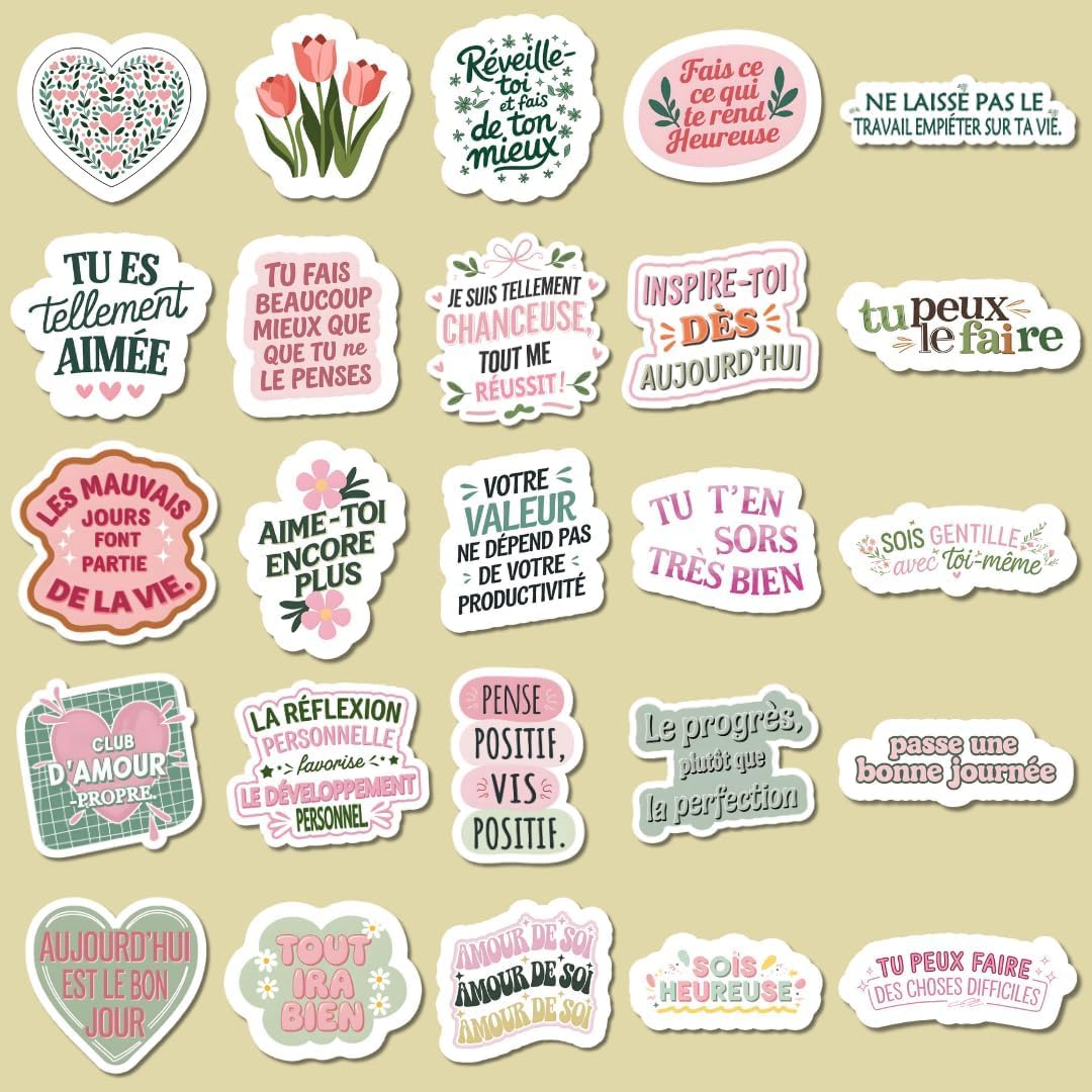 Lot de 75 autocollants inspirants au style doux et coloré, avec citations positives, finition mate imperméable, parfaits pour décorer carnet, laptop, gourde ou journal de gratitude.